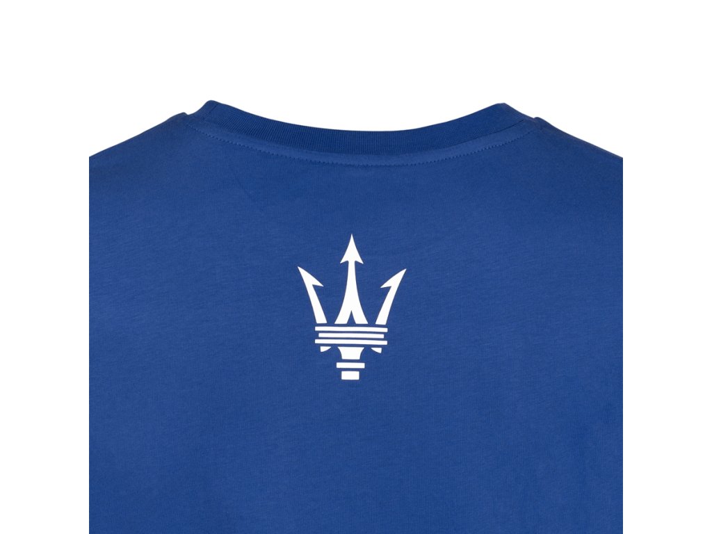 Luxusní pánské tričko Maserati v modrém provedení. Triko Maserati s 3D nápisem Maserati na boční straně. Zadní strana je ozdobena 3D logem trojzubce.