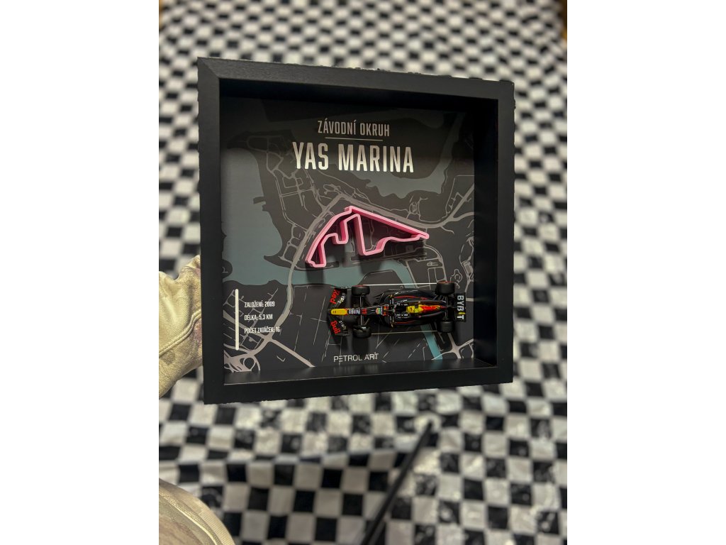Obraz s modelem monopostu a 3D siluetou okruhu závodu