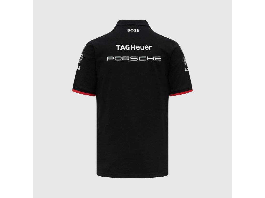 Týmová polokošile týmu Porsche Formule E x Hugo Boss v luxusním provedení. Černá polokošile Porsche s logy sponzorů, doplněné citem pro detail. Oficiální týmová polokošile Porsche Motorsport Formule E x Hugo Boss nošená jezdci a členy týmu.