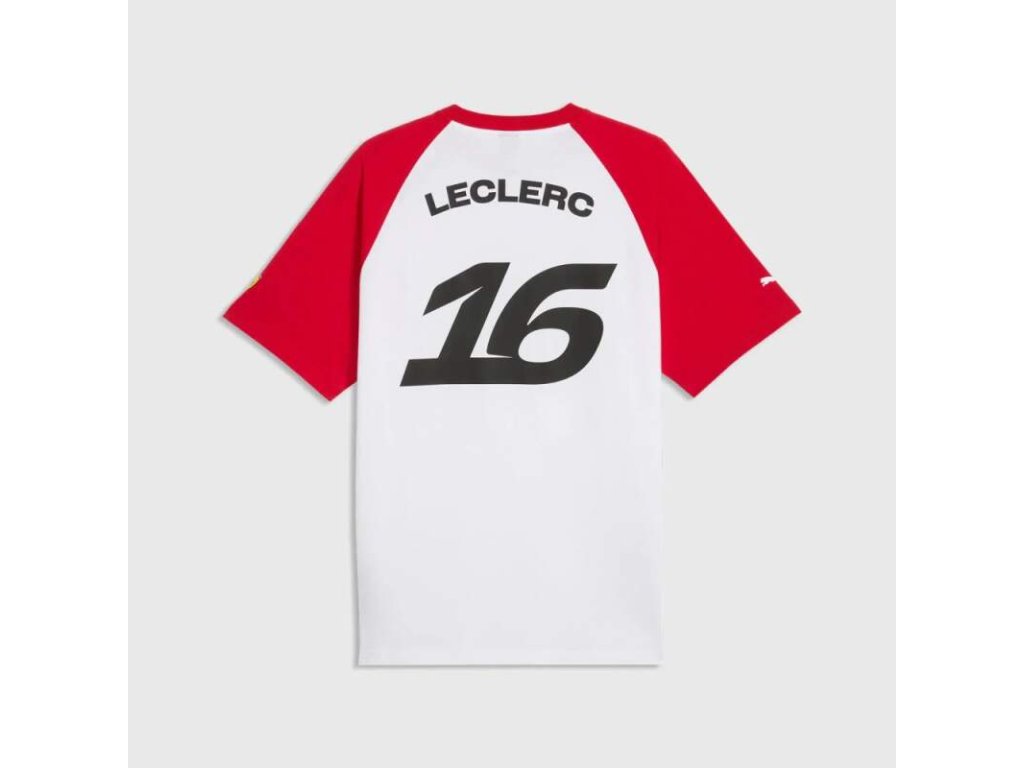Fanouškovské tričko Scuderia Ferrari F1 v barvách Charlese Leclerca. Fanouškovské tričko Ferrari - Charles Leclerc s nápisem Leclerc a číslem 16. Boční stranu zdobí logo Puma.