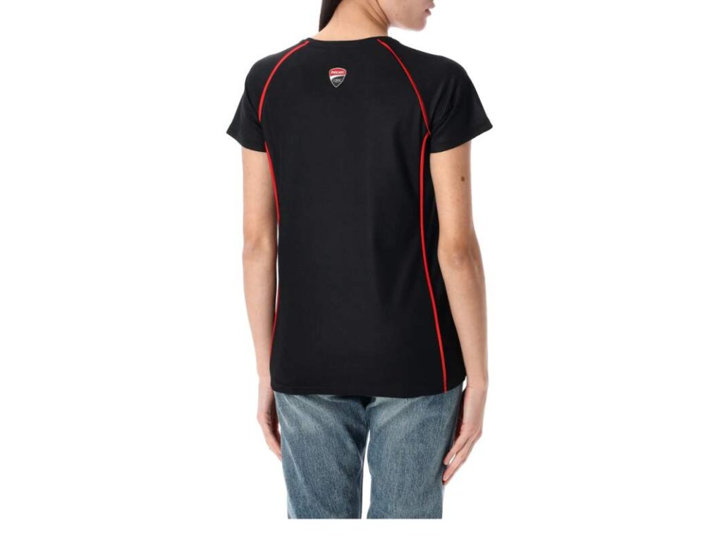 Dámské tričko Ducati s nápisem na hrudi. Dámské tričko Ducati Corse doplněné nápisem Ducati Corse v černo-červeném provedení. Pohodlný materiál, oficiální kolekce MotoGP.